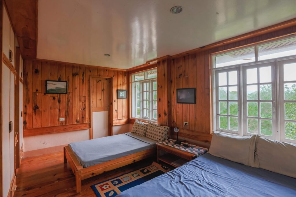 The bedrooms showcase handcrafted wooden beds made from the surrounding pine trees by local artisans. These provide perfect temperature balance and stability for the foam mattresses they hold.